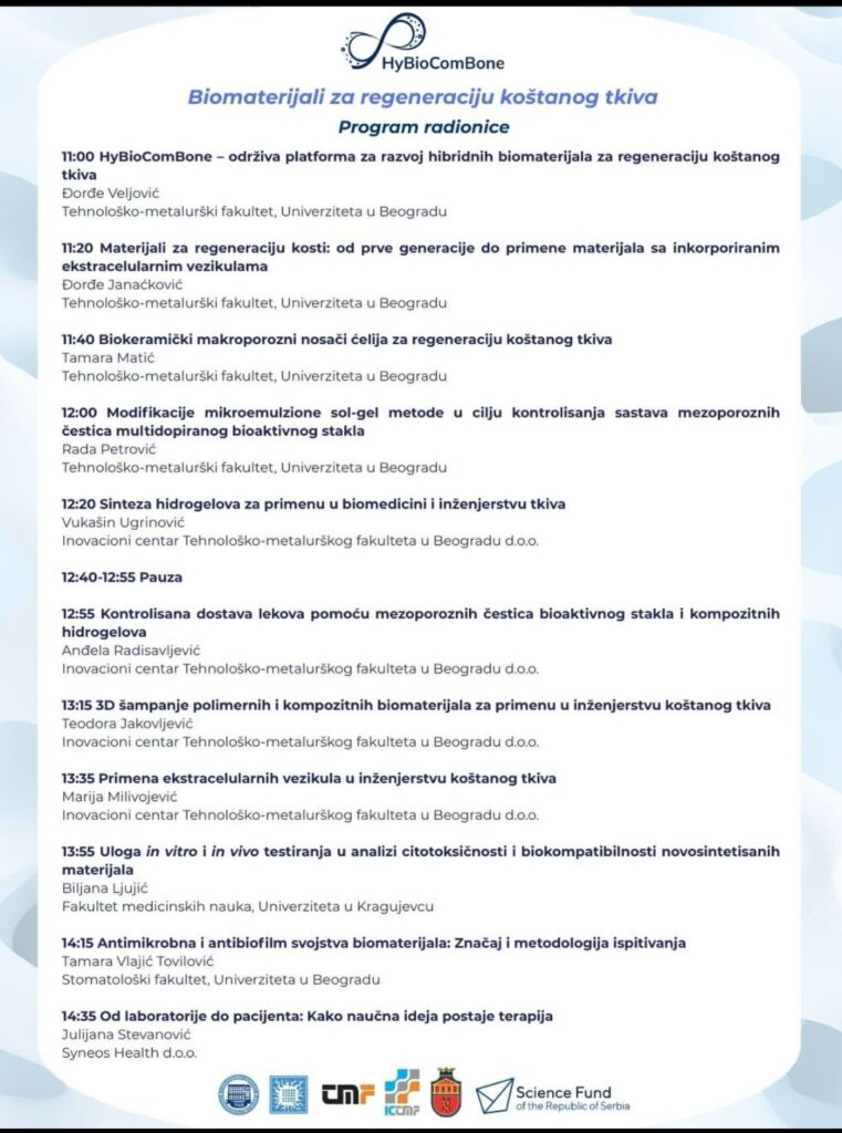 On 19 March 2026, the HyBioComBone project organised a workshop entitled “Biomaterials for bone tissue regeneration”, which took place in the ceremonial hall of the Faculty of Technology and Metallurgy from 11 a.m. The workshop focused on modern advances in the development of biomaterials for bone tissue regeneration, adopting a multidisciplinary approach that integrates new generation materials, nanotechnology, biomedical engineering, and clinical applications. Participants had the opportunity to learn about hybrid biomaterials for bone tissue regeneration, bioactive materials with regenerative and therapeutic potential, and controlled drug delivery systems. They also learned about modern research methods and approaches in biomedicine and materials engineering.